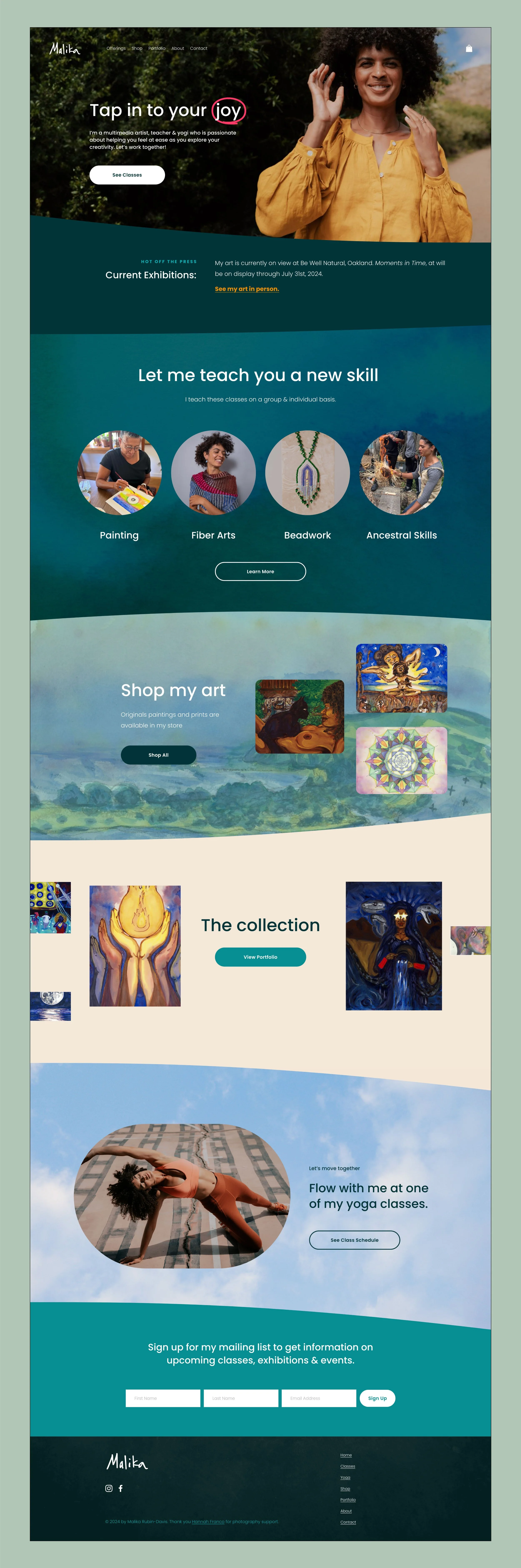 Malika Rubin Davis is a multimedia artist, teacher and yogi based in Oakland, California. She needed to establish her online presence so prospective students, collaborators, collectors and curators could connect with her.
